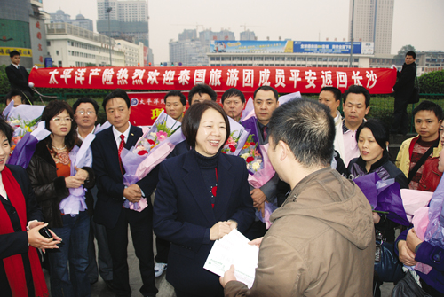 滞留泰国的游客送上鲜花,同时,根据之前湖南新康辉国际旅行社与太保产险湖南岳麓支公司签订的保险团购合同旅行社责任险条款,他们向每一位返乡的游客送上