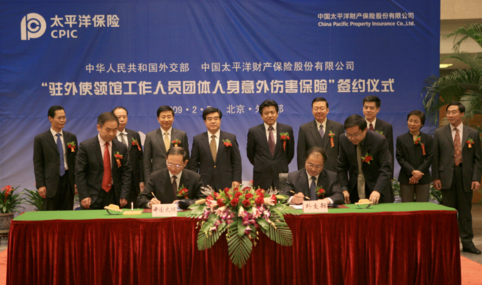2009年2月5日,太保与中国外交部在北京 举行了“驻外使领馆工作人员团体人身意外伤害保险”合作协议签约仪式。根据协议,从今年开始,太保将为全球各个国家和地区近250个使领馆的5000多名 外交人员和随行家属提供每年保额达26亿元的保险保障。中国外交部副部长李金章、中国保监会副主席周延礼及太保集团董事长高国富、总经理霍联宏、太保产险 总经理吴宗敏等出席了签约仪式。